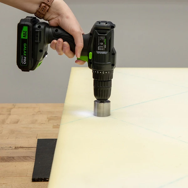 When using the hole cutter, drill straight down to cut your foam, and then keep the drill engaged as you lift the hole cutter out. Keeping the drill on will pull the cut hole out of your foam piece. Place a cutting mat underneath the foam to protect your work surface.