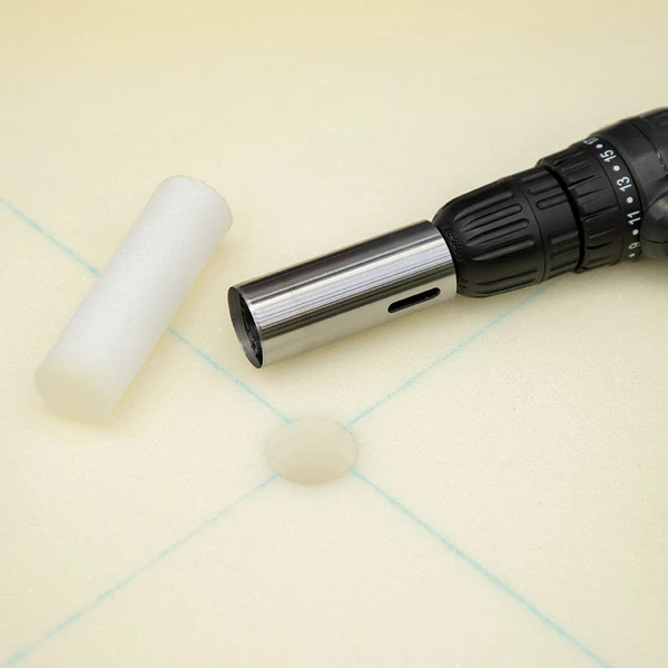 Use this Foam Hole Cutter to cut precise, perfectly sized holes in your polyurethane upholstery foam for button tufting. The extremely sharp carbonized cutting edge cuts through seating foam with ease. The hole in the foam will allow the button to sink into the foam for a professional-looking tufted upholstery piece. The cutting cylinder is 3 inches, but you can cut through a maximum thickness of 5 inches by compressing the foam when drilling. This hole cutter attaches to a drill press or a handheld power drill.