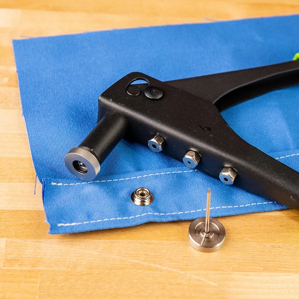 The SnapRite Dies work with any standard rivet gun, so buying a new rivet tool is unnecessary if you already have one. Dies screw into the rivet gun’s nosepiece and must be used with a SnapRite Mandrel (included). Position fasteners, punch the mandrel through the fabric assembly and rivet the fasteners in place.