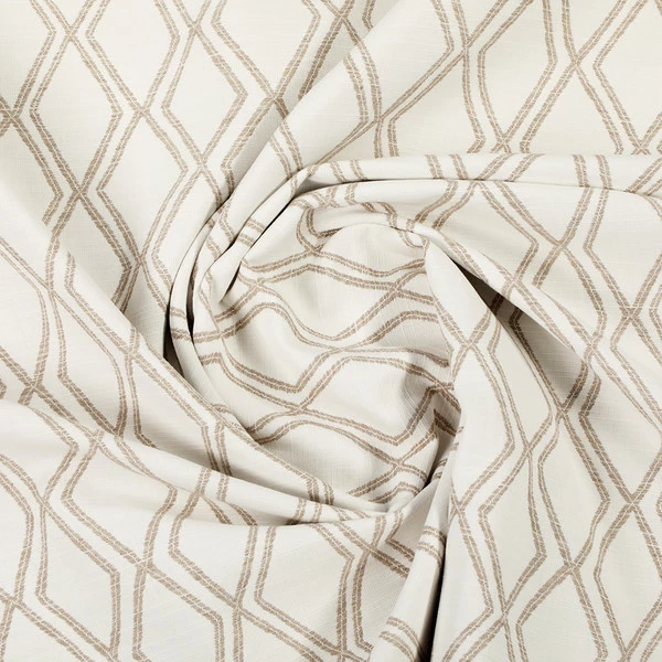 Sunbrella® Voyage Dune is a 100% acrylic performance fabric. It features a geometric pattern of stone-outlined diamonds on a white background that brings subtle sophistication to whatever project it’s used for.